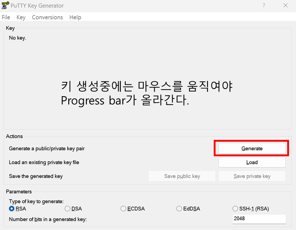 (2) puttygen.exe를 실행한 뒤에 하단의 Generate 버튼을 클릭한다. 키 생성 중에는 마우스 움직여야한다!
