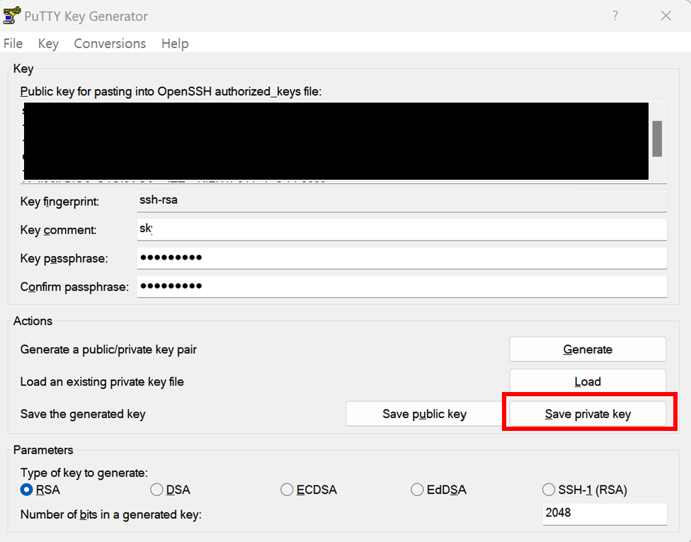 (3) key 가 생성되면, key comment 계정명 생성 (구글 ID 등), 암호를 생성하고 Save Private key 버튼을 클릭한다.