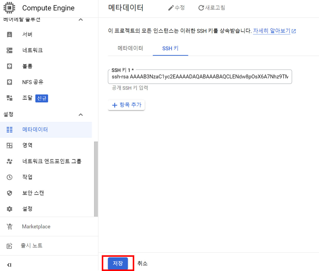 (4) 이제 SSH 키를 GCP에 등록한다. Compute Engine메뉴에서 설정에 메타데이터 항목에 접속, ssh 키 선택