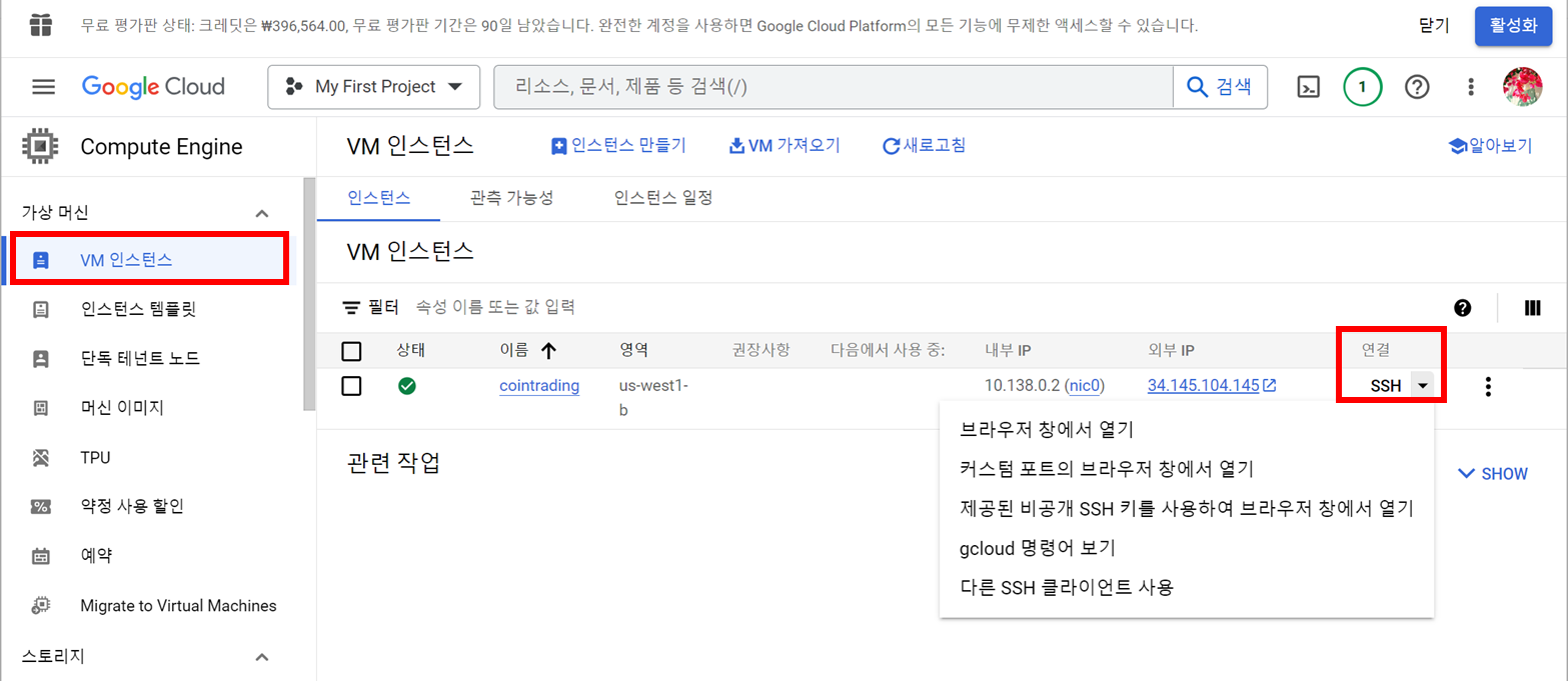compute engine를 선택하고 생성된 VM인스턴트를 보면 ssh가 있습니다.