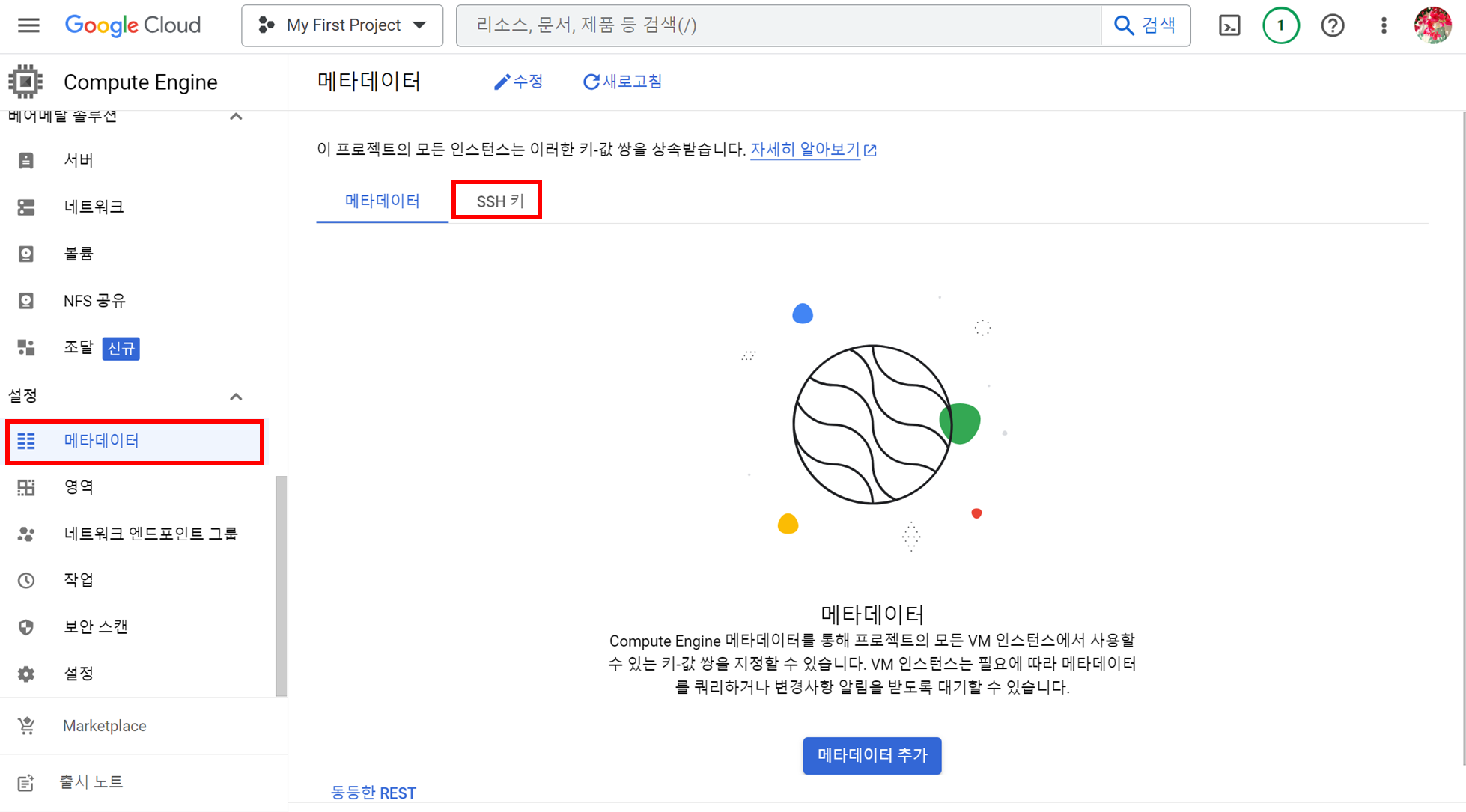 (4) 이제 SSH 키를 GCP에 등록한다. Compute Engine메뉴에서 설정에 메타데이터 항목에 접속, ssh 키 선택