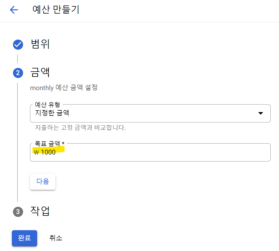 3. 금액에서는 예산유형은 지정한 금액 , 목표금액 1000원 설정