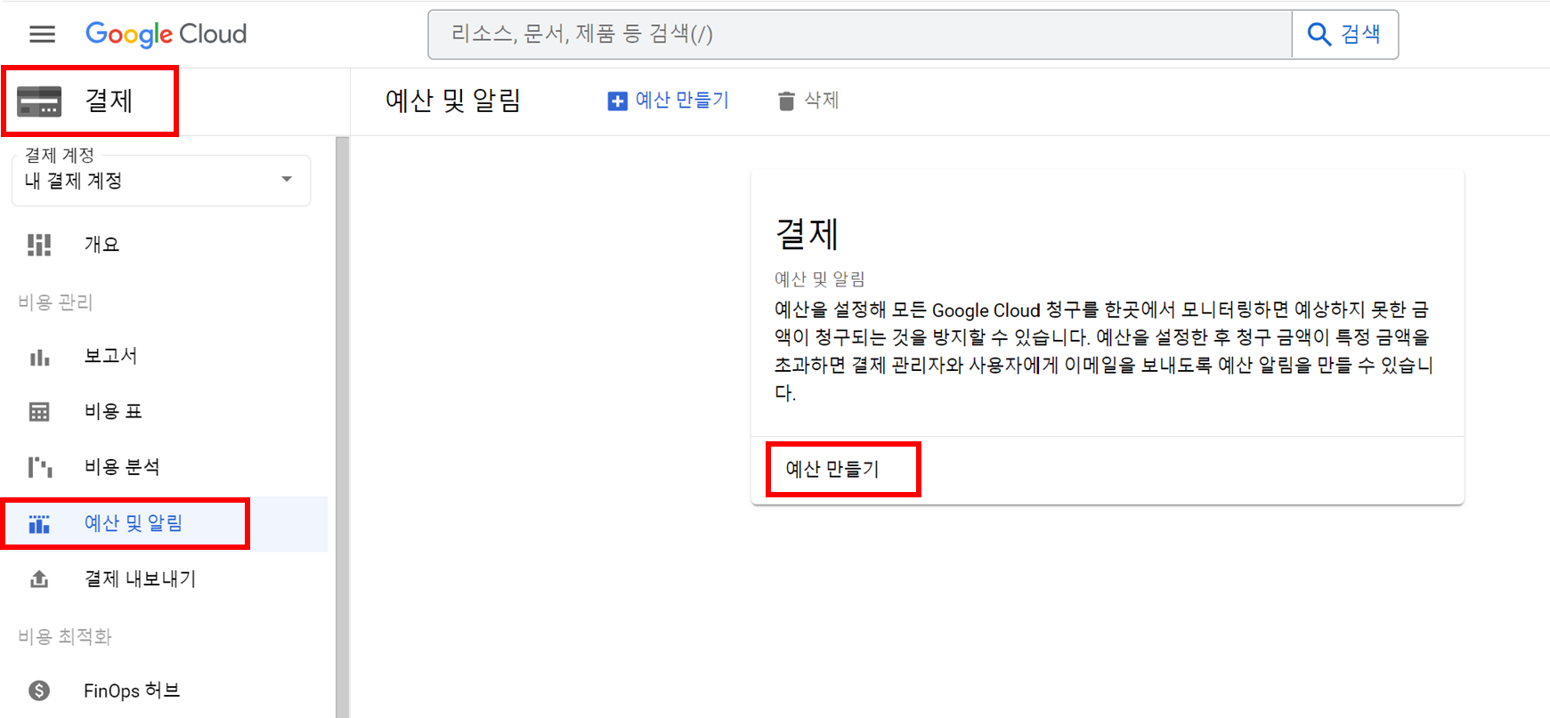 1. 결제 > 예산 및 알림 메뉴에서 예산만들기 선택