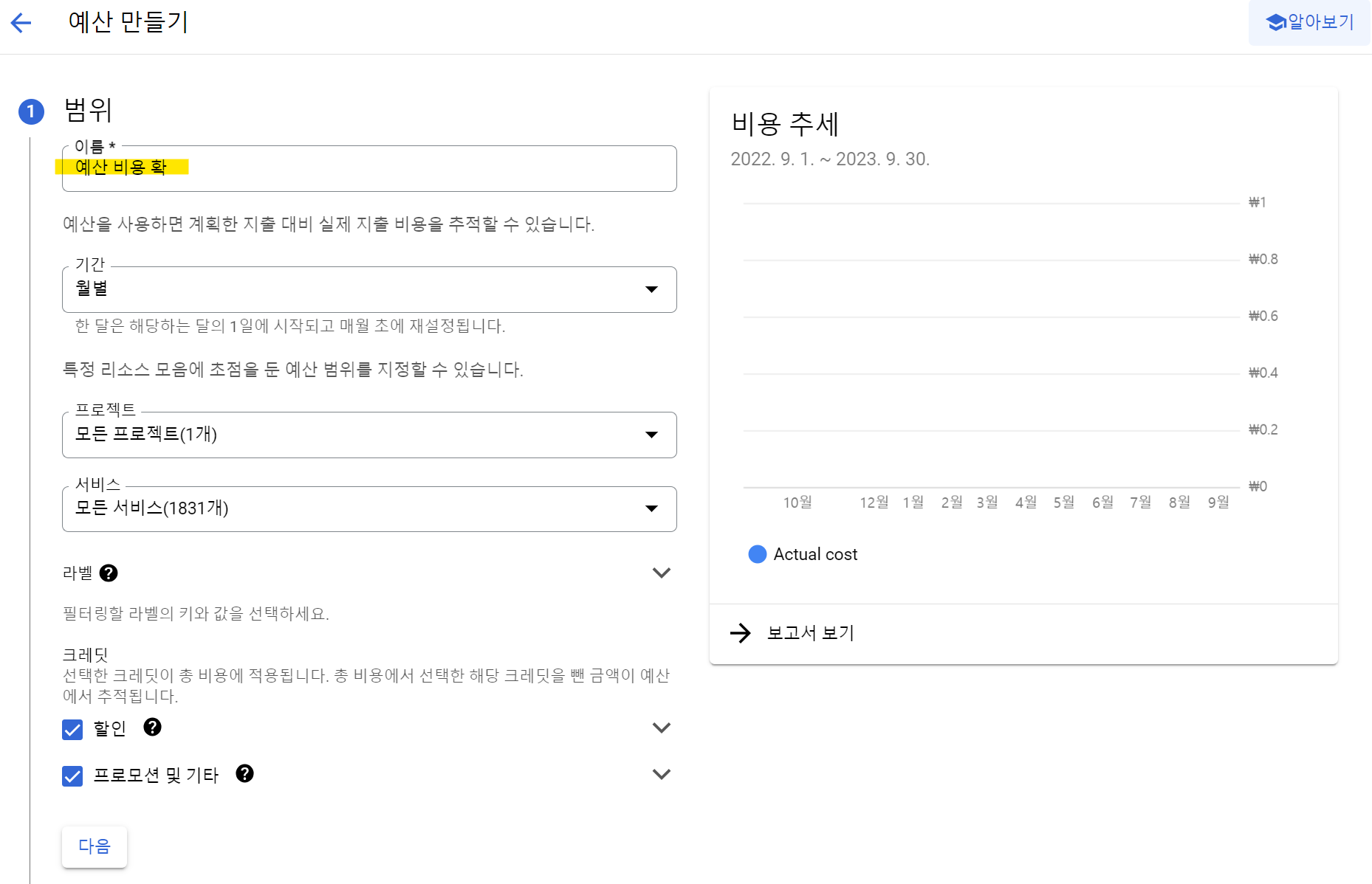 그것을 막기위해 예산을 설정하고 알림을 주는 기능이 있습니다. 그 기능을 설정해보겠습니다.