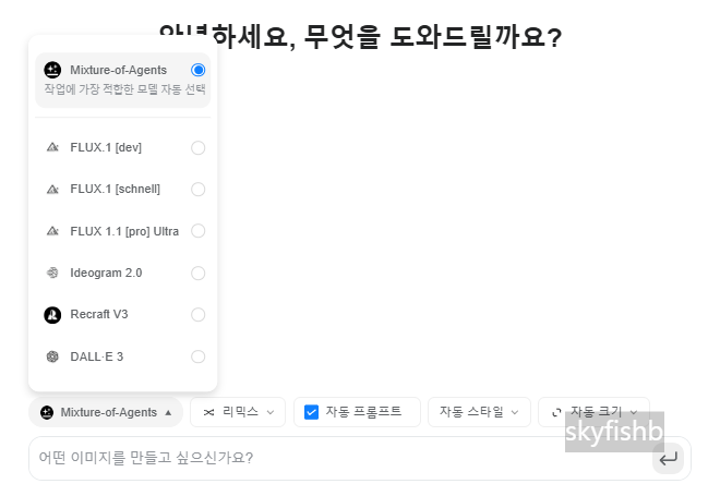 - 사용가능한 모델은 FLUX / ideogram (문자는 이걸로) / Recraft / Dall-e 3