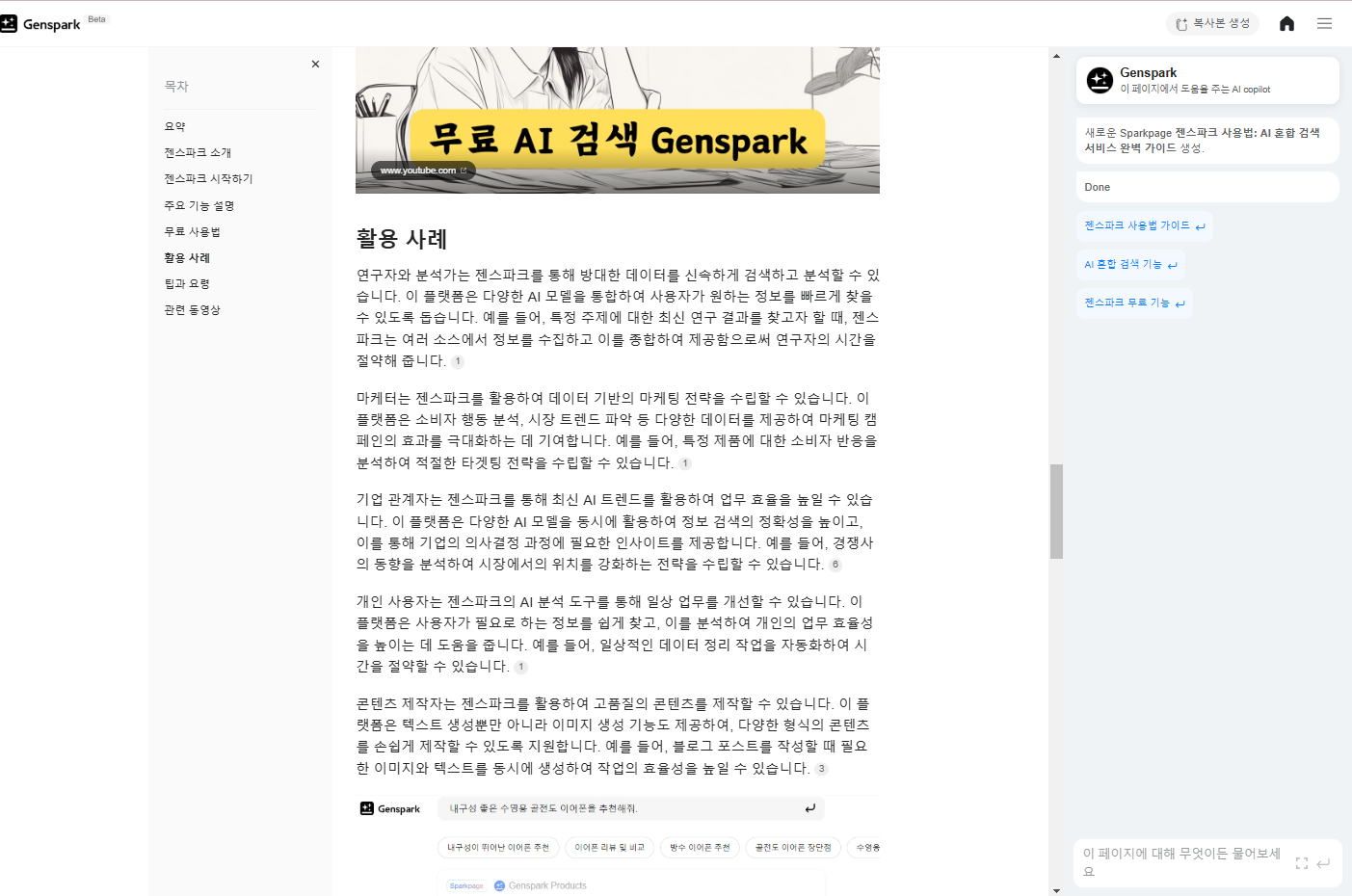 바로 검색을 해봅시다. 질문은 Genspark 사용법 알려줘.