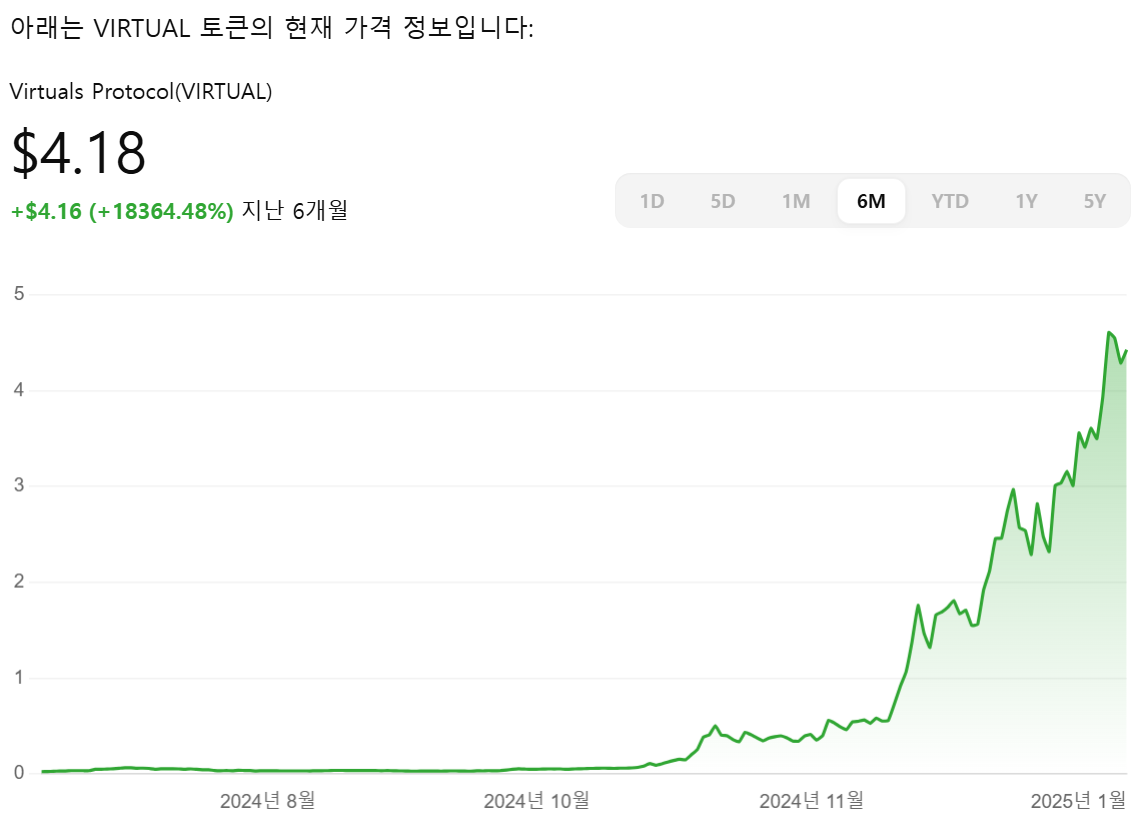 - 상장 거래소: VIRTUAL 토큰은 현재 (2025.1.5) 기준 비트겟, 바이빗, 빗썸 등 여러 주요 암호화폐 거래소에서 거래가능