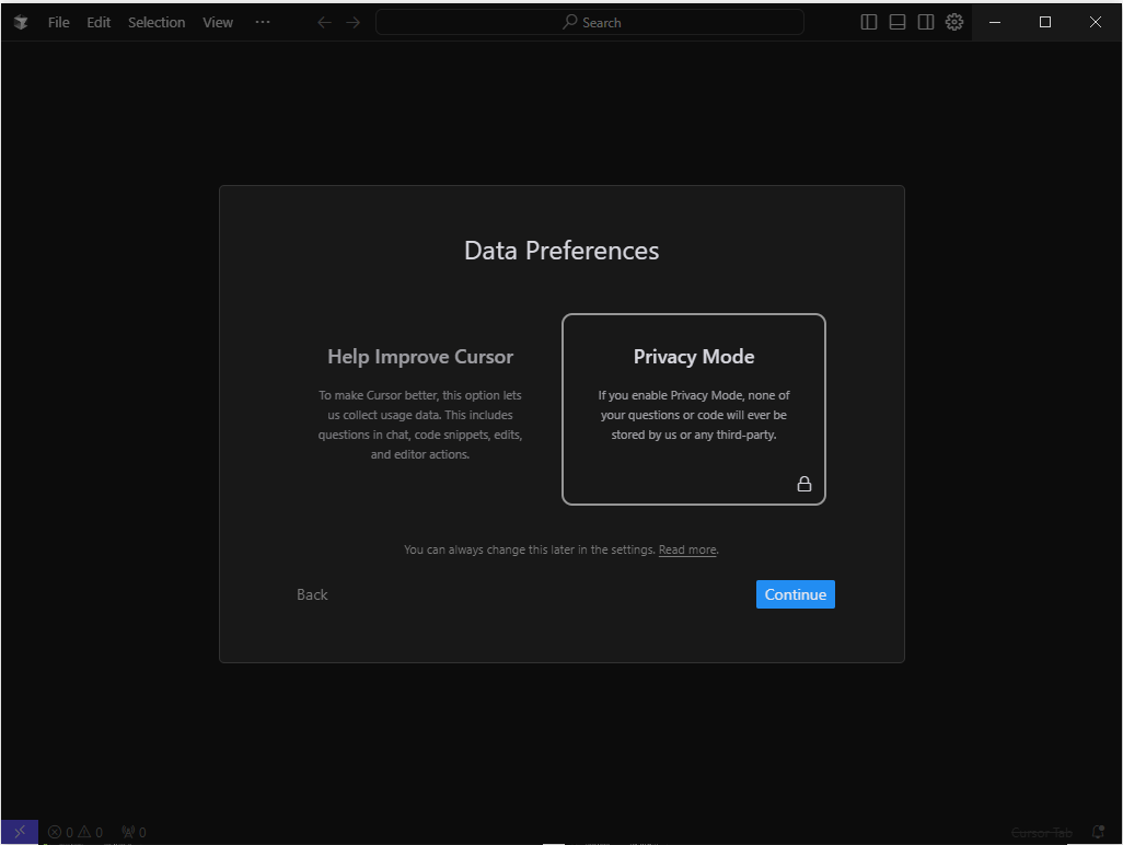 - 'Privacy Mode'를 선택하면 사용자의 코드가 원격 서버에 저장되지 않습니다.