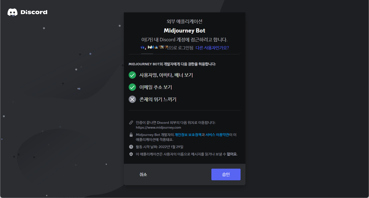 미드저니 홈페이지에서 Sign In을 누르면 디스코드가 윈도우 또는 앱에 깔려있을 때, 다음과 같이 연결을 승인할지 여부를 묻습니다. 그러면 승인을 하면 됩니다.