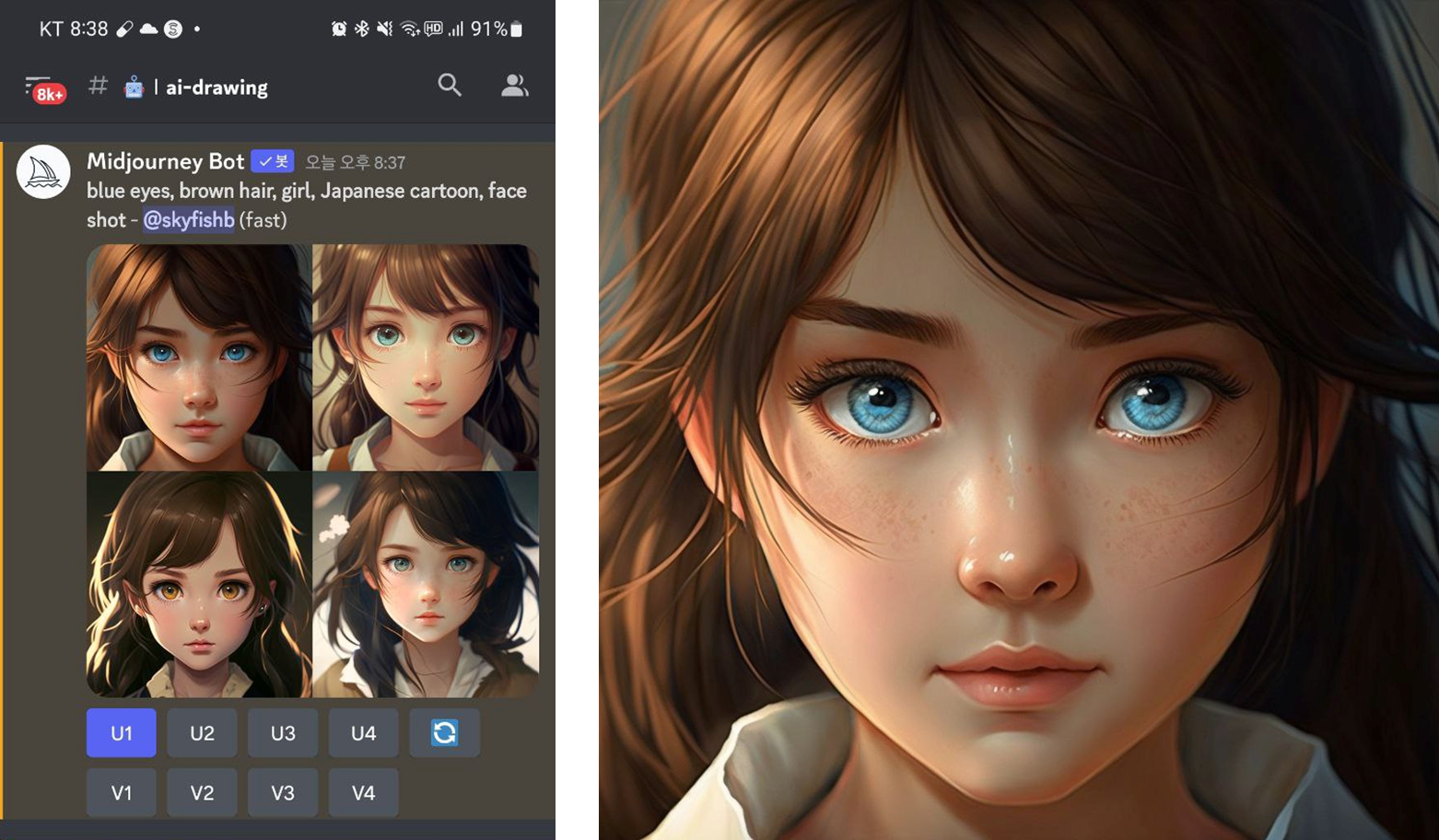 그림은 4개가 기본으로 출력되는데 처음 나온 그림들은 눈이 이상하거나, 입술이 이상하거나 한 이미지들이 나올 수 있습니다. 출력된 그림은 왼쪽부터 오른쪽으로 왼쪽 위부터 1, 2 아래쪽 3, 4 번에 해당하고, U는 upscale 로 U1을 선택한다면 위의 그림과 1번 그림이 맘에 들어서 조금 더 정교한 AI로 생성을 요청하는 것입니다. 그리고 V는 variation 인데, V1을 누르면 V1이랑 비슷하면서 다른 느낌으로 4장을 새로 생성하게 됩니다. 마음에 안들면 옆에 새로고침을 해도 4개가 생성됩니다.