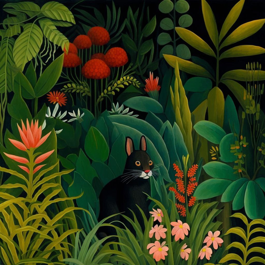 tropical plants with flowers and black rabbit henri rousseau style