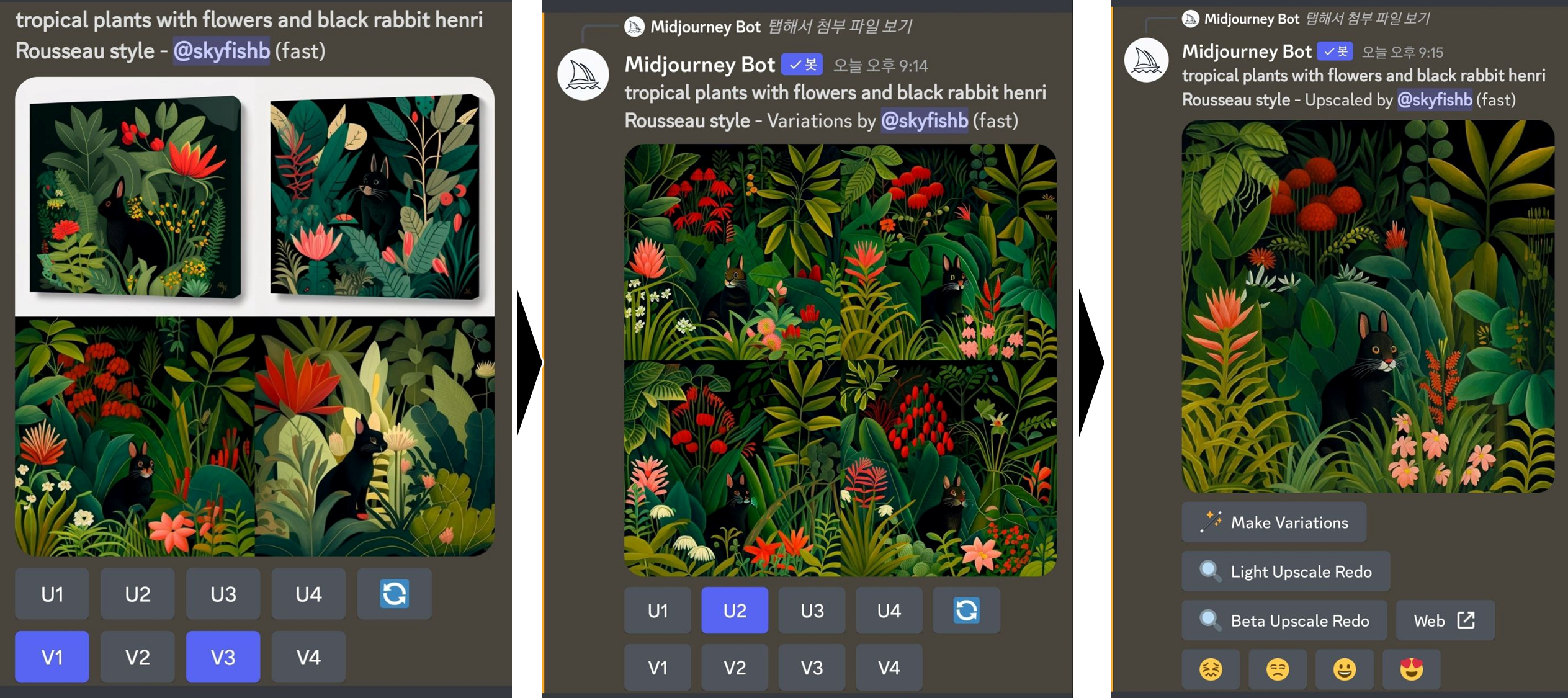 앙리루소 스타일의 정글있는 검은 토끼의 최종 결과물입니다. 꽤 맘에 들게 나왔습니다. 귀 부분을 조금더 길게 수정을 하고 싶은데 아직은 어렵네요. 이미지가 만들어지는 시간은 1분 내외로 빠릅니다만 미드저니 디스코드는 사용자가 많아서 디스코드 렉이 걸릴 수 있습니다.