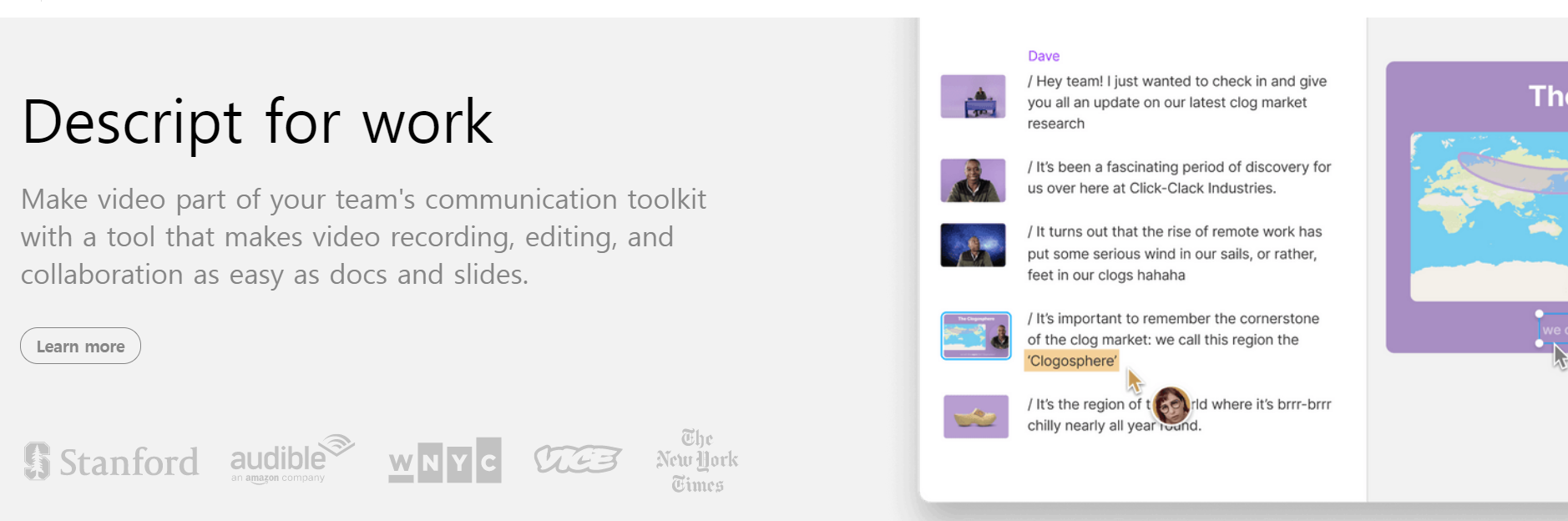 Descript (https://www.descript.com/)는 AI 기술을 활용해서 비디오 편집을 일반 텍스트 문서 편집만큼 쉽게 만들 수 있습니다. 직관적인 비디오 편집 프레임워크인 Storyboard 가 출시되며 오픈AI로부터 5000만 달러 규모의 시리즈C 투자가 이뤄졌다고 합니다. 기본적으로 오디오, 비디오 편집기이며 음성을 자동 기록하고 자동으로 화자를 분리하며 다국어 번역까지 쉽게 가능하고 비디오 편집은 기존의 타임라인에서의 편집과는 차별화된 UI/UX를 보여준다고 하니 확인해보세요. 무료로 기능확인가능, 월 12달러 가격정책부터 시작하네요.