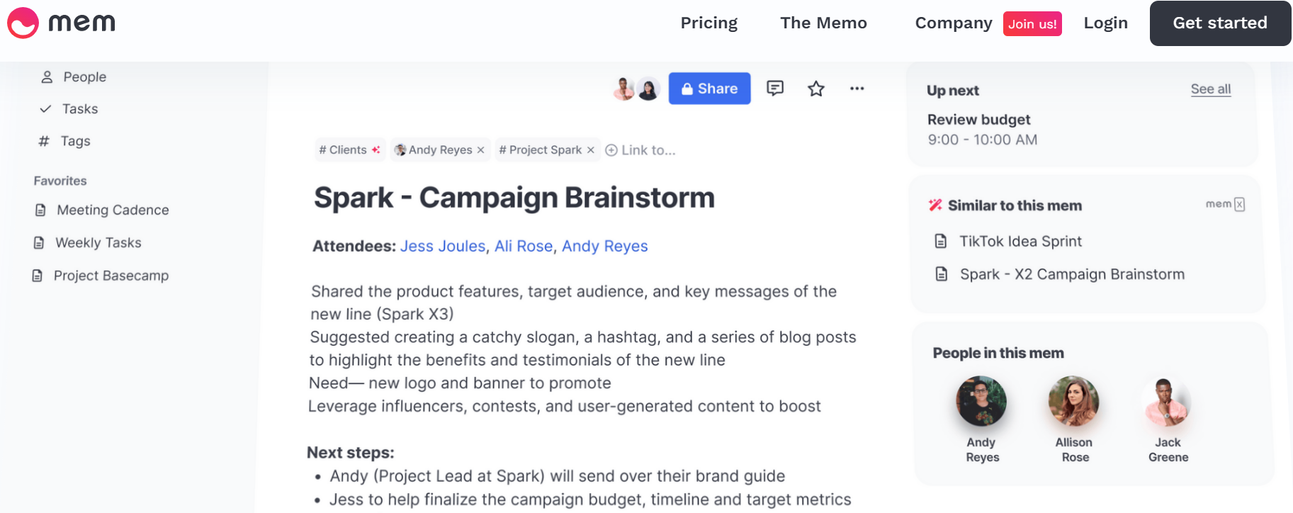 Lightcap은 "Mem은 강력한 AI를 사용하여 정보를 구성하고 액세스하는 지루하고 고된 작업을 제거하여 궁극적으로 사람들이 중요한 작업 부분에 집중할 수 있도록 함으로써 지식 근로자의 생산성을 높입니다."라고 말했습니다.