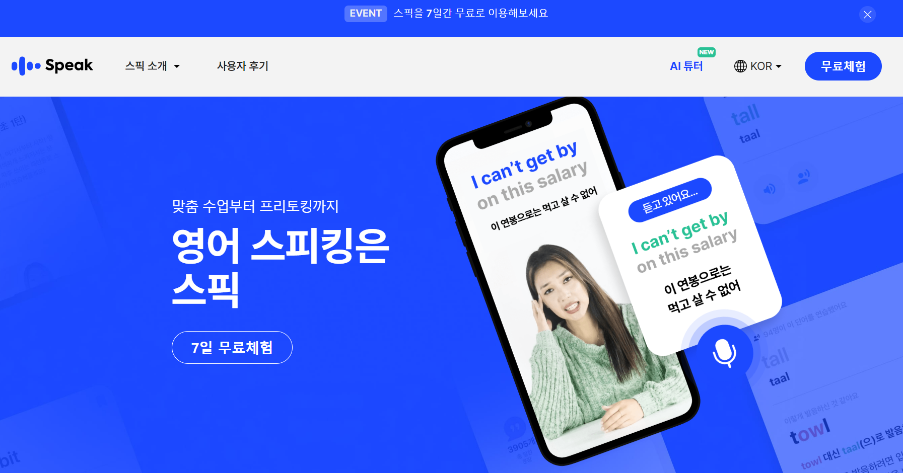 Speak (https://www.speak.com/) 은 한국에서 서비스하고 있는 영어교육 스타트업입니다. 처음에 한국을 중심으로 동아시아에서 시작했으며 거의 100,000명의 유료 가입자를 보유하고 있습니다. Speak는 발음, 문법, 어휘 등에 대한 실시간 피드백을 제공하여 다양한 주제에 대해 학습자와 개방형 대화를 할 수 있는 AI 튜터를 만들고 있습니다. 22년 11월에 스픽 운영사 스픽이지랩스는 2700 만달러 (한화 약 382억원) 규모의 시리즈B투자를 유치했습니다.