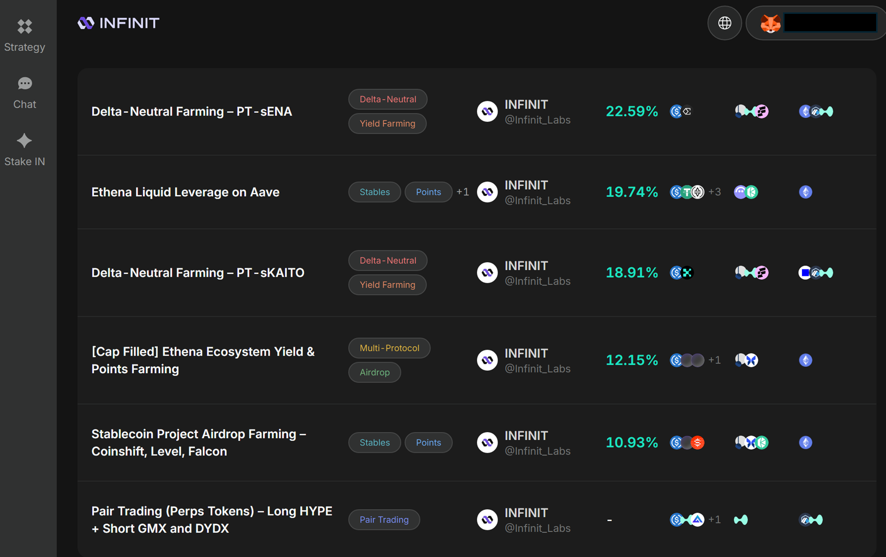 INFINIT는 DeFi 추상화 레이어로, AI 기반 에이전트를 활용해 복잡한 DeFi 전략을 단순화합니다.
