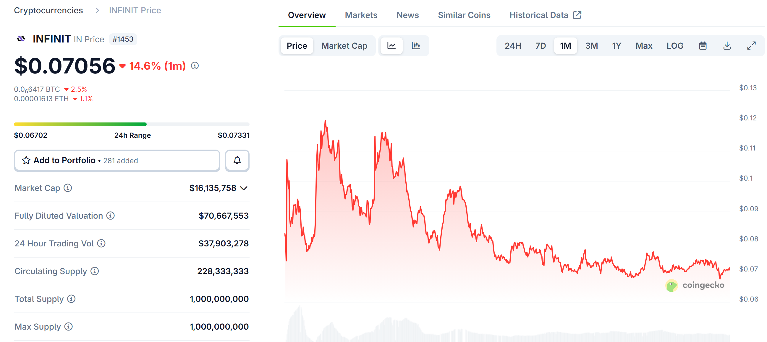2025년 9월 기준, $IN은 Bitget, Gate, KuCoin 등 주요 거래소에서 활발히 거래되고 있으며,시가총액 약 $1,642만 USD를 기록했습니다.