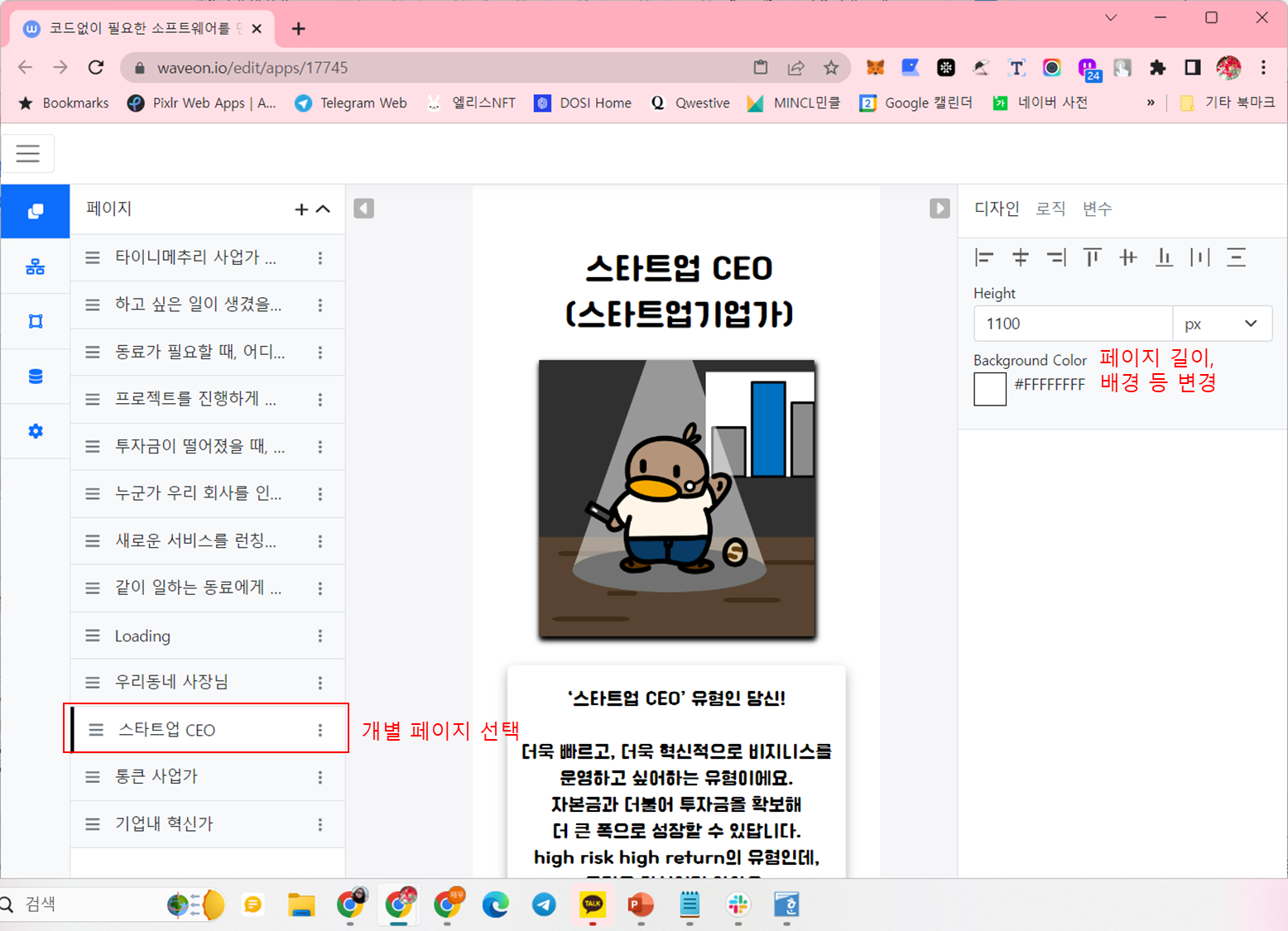 - 재미로 한번 만들어보기 좋은데, 쟁쟁한 경쟁사 (webflow, bubble, cafe24, moaform 등)들이 많아서