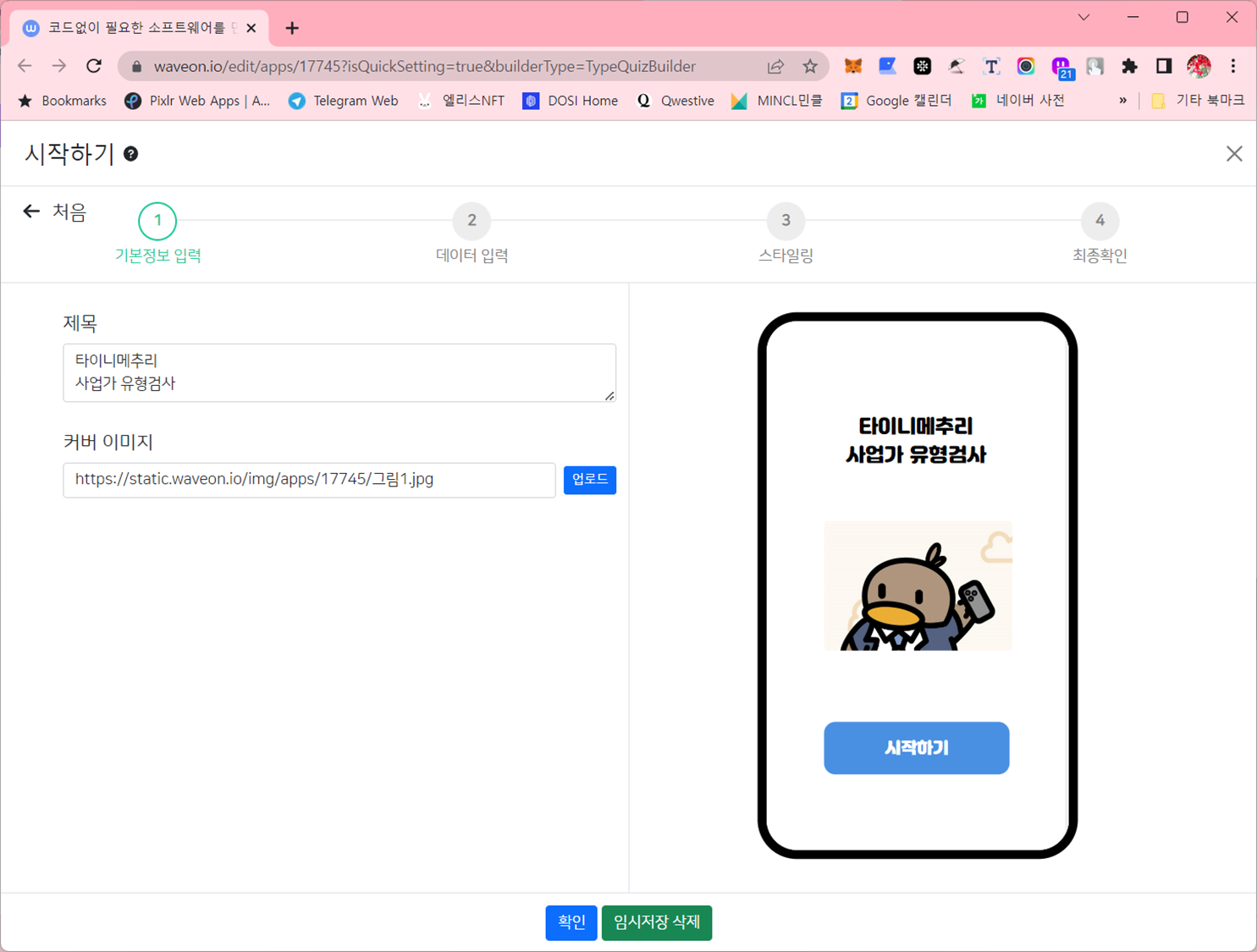 웨이브온은 이용해서 간단하게 사업가유형검사를 만들어 볼 수 있습니다. 제가 취미로 하는 사이드 NFT프로젝트 하찮은메추리 (Tiny Metury)에서 "사업가유형검사" 를 만들어 보기로 했습니다.