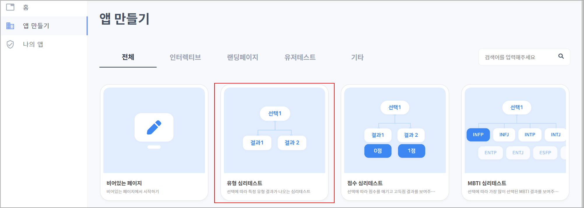 - 전체, 인터렉티브, 랜딩페이지, 유저테스트, 기타 항목에서 템플릿을 확인할 수 있습니다. 비어있는 페이지도 만들 수 있어서 자유도가 높습니다. 간단한 유형 심리테스트 선택합니다.