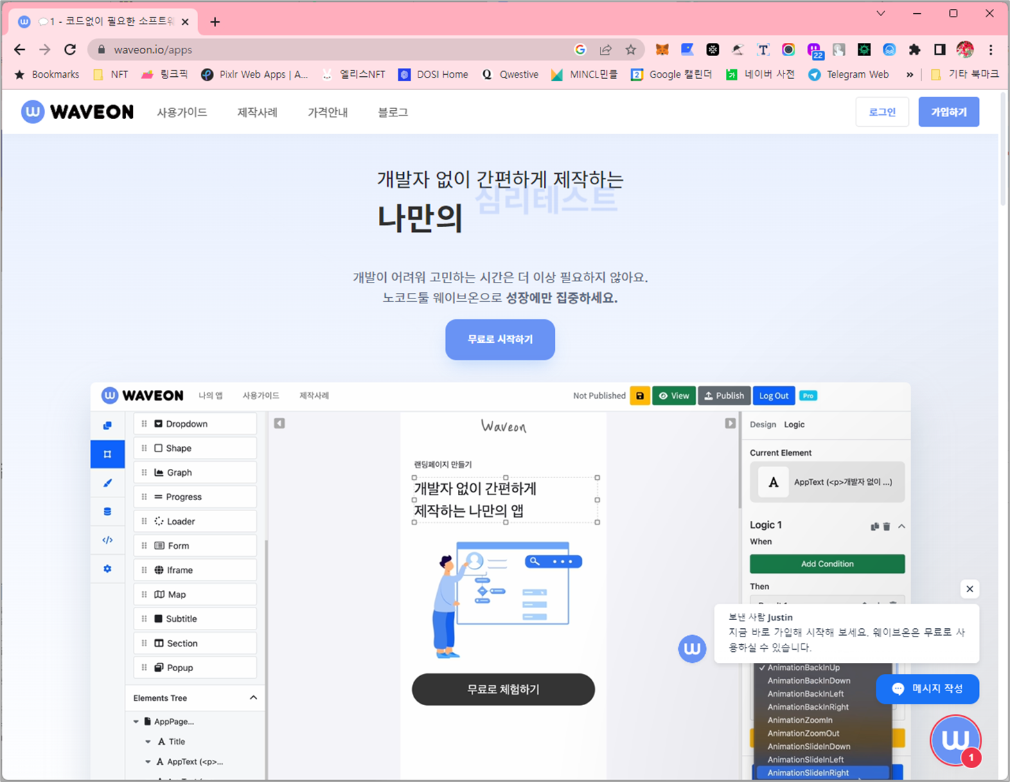 개인적으로 AI와 만난 노코드툴이 대세가 될 것 같다. 사업을 하는 입장에서는 괜찮은 아이디어가 떠올라서 바로 서비스를 만들고 싶어도 비용과 시간이 들어가면 주저하게 되는데 요즘 AI 기술과 노코드툴을 활용하면 순식간에 서비스를 만들어볼 수 있다. 오늘은 내가 관심있게 서비스 업그레이드를 관찰하고 있는 국내 노코드 툴, 웨이브온 (waveon)에 대해서 소개하고자 한다.