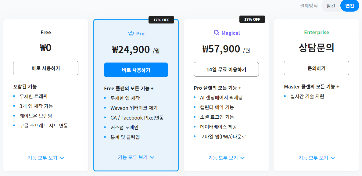 - 기본가격은 0원이고, 월결제시 29900원 부터 프로모드가 시작되고 연결제시 월 24,900원 비용으로 결제된다.