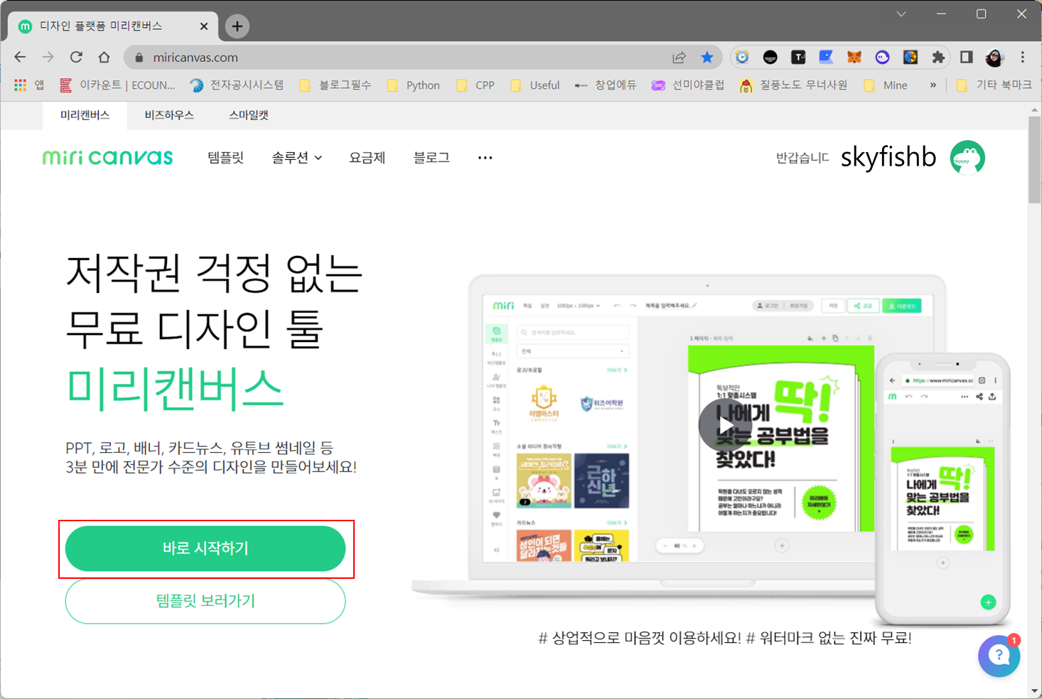 미리캔버스 주소 (http://miricanvas.com) 로 들어가면 바로 시작하기, 템플릿 보러가기 버튼이 보입니다.