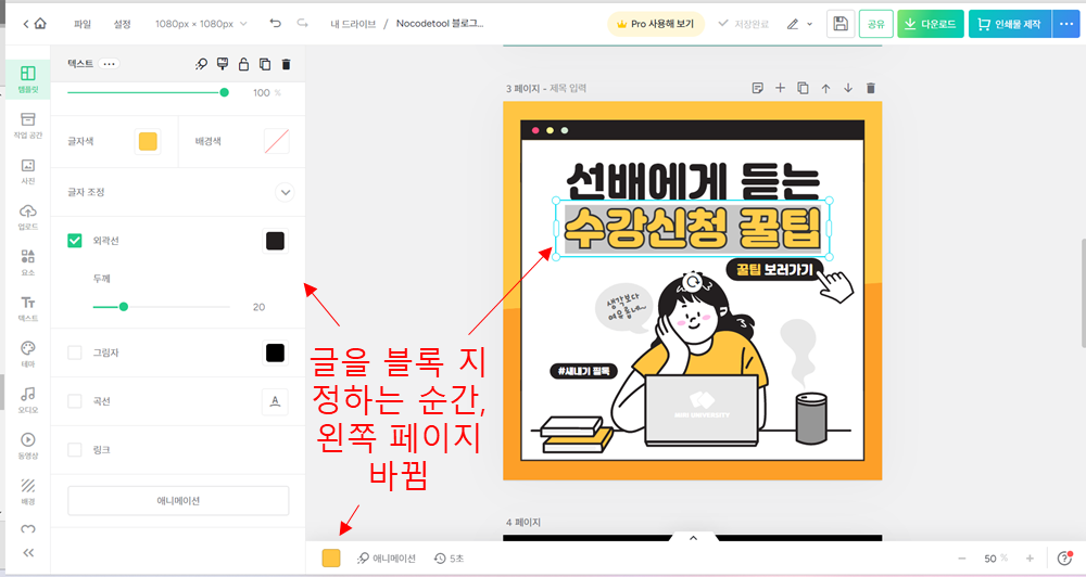 요소를 선택하거나, 문자의 블록을 지정하는 순간 왼쪽의 페이지가 업데이트 되면서 수정이 가능합니다.