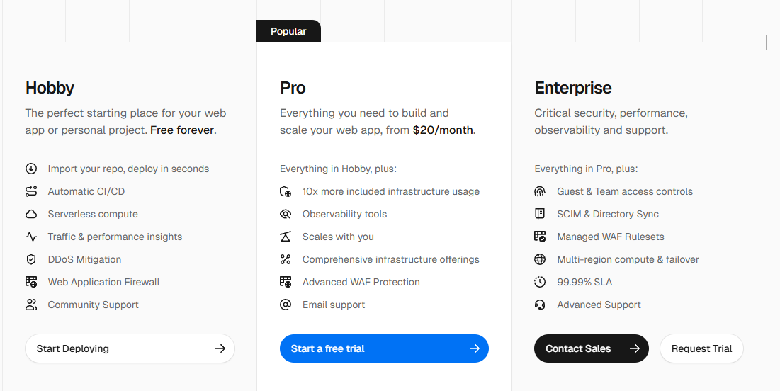 Vercel은 Next.js 개발팀이 만든 호스팅 플랫폼으로, 정적 사이트와 서버리스 기능을 위한 클라우드 서비스를 제공합니다. 개발자들은 복잡한 설정이나 관리 없이도 즉시 배포할 수 있으며, 자동으로 확장되어 웹 사이트 및 웹 서비스를 호스팅할 수 있습니다. 또한, GitHub, GitLab, Bitbucket 등의 저장소와 연동하여 코드 푸시 시 자동으로 배포할 수 있습니다.