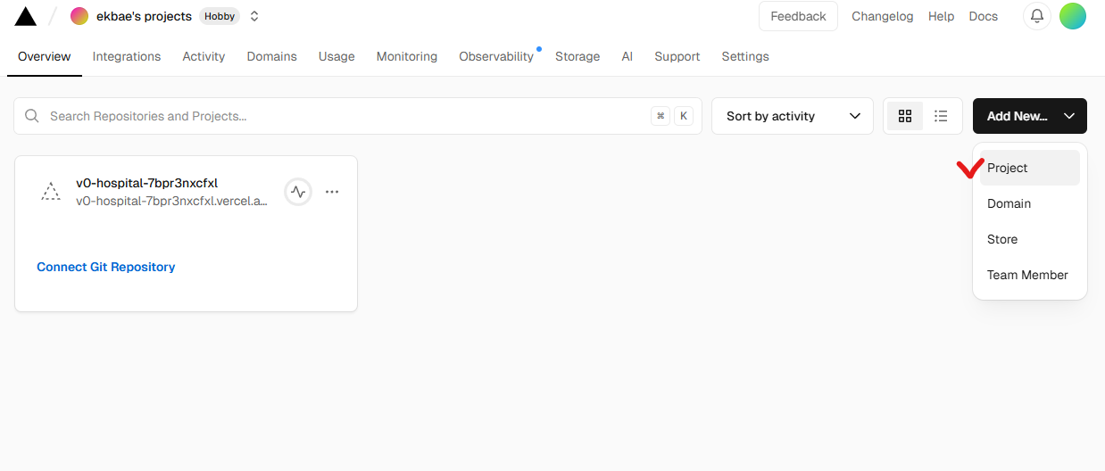- 연동된 Git 저장소 목록에서 배포하려는 프로젝트를 선택하거나, 저장소 URL을 직접 입력하여 프로젝트를 가져올 수 있습니다.