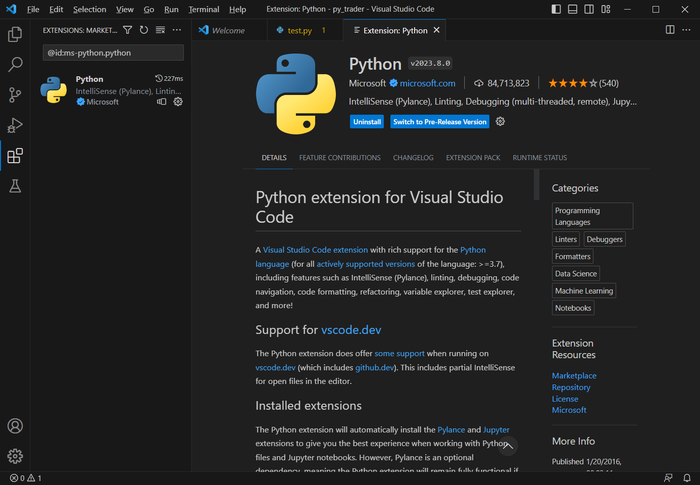 만약 저런 Install 창을 실수로 꺼버렸으면 Extension 버튼 (네모 블럭) 을 누르고, python을 검색하여 Install 을 하면됩니다.
