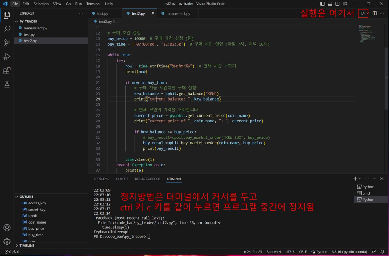 이전 포스팅에서 업비트 API의 Access key와 Secret key를 코드에 입력해서 자산을 조회하는 코드를 vscode에서 돌려봤습니다. 이번에는 지정된 코인을 지정된 시간에 자동으로 구매가능한 코드를 만들어 보겠습니다.