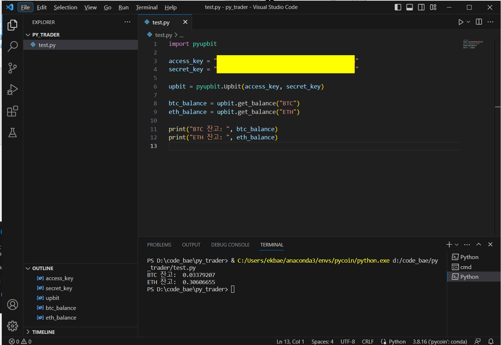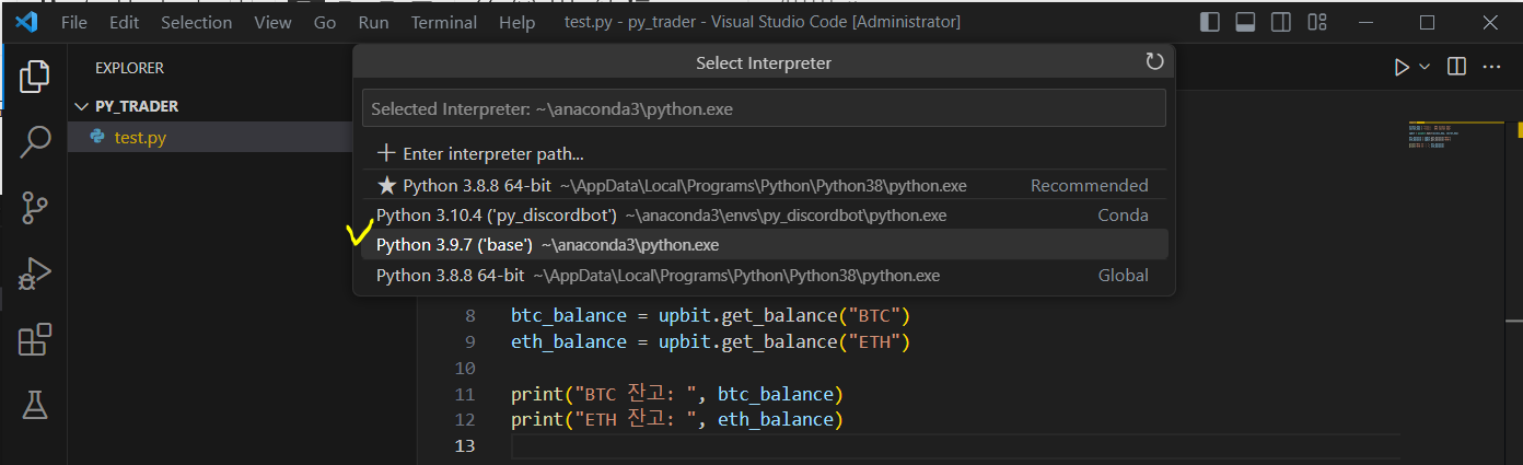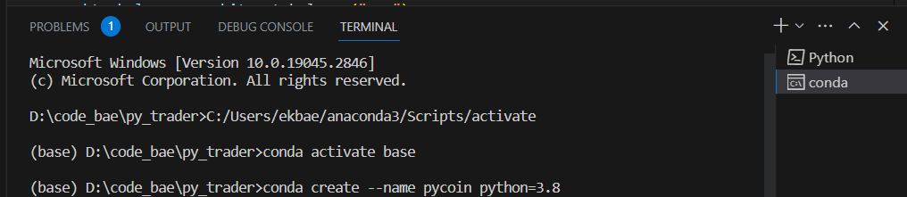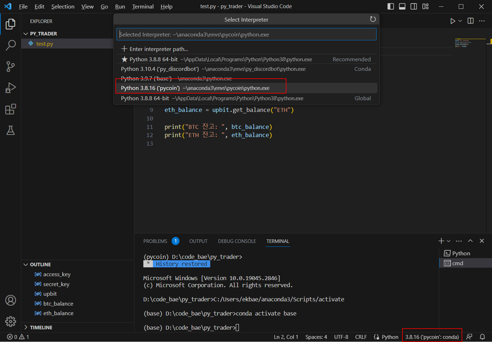 코드상으로 conda activate pycoin 을 쳐서 시키는 방법과 위의 다시 ctrl +shift+ p에서 python select interpreter 에서 (pycoin) 경로를 설정하는 방법입니다.
