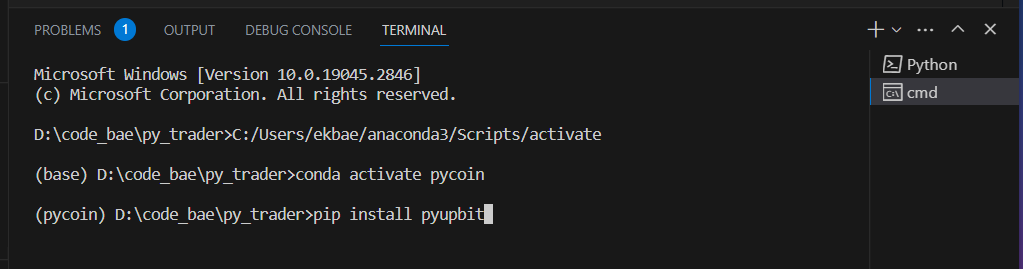 terminal 에서 pyupbit 패키지 다운 코드 입력하기
