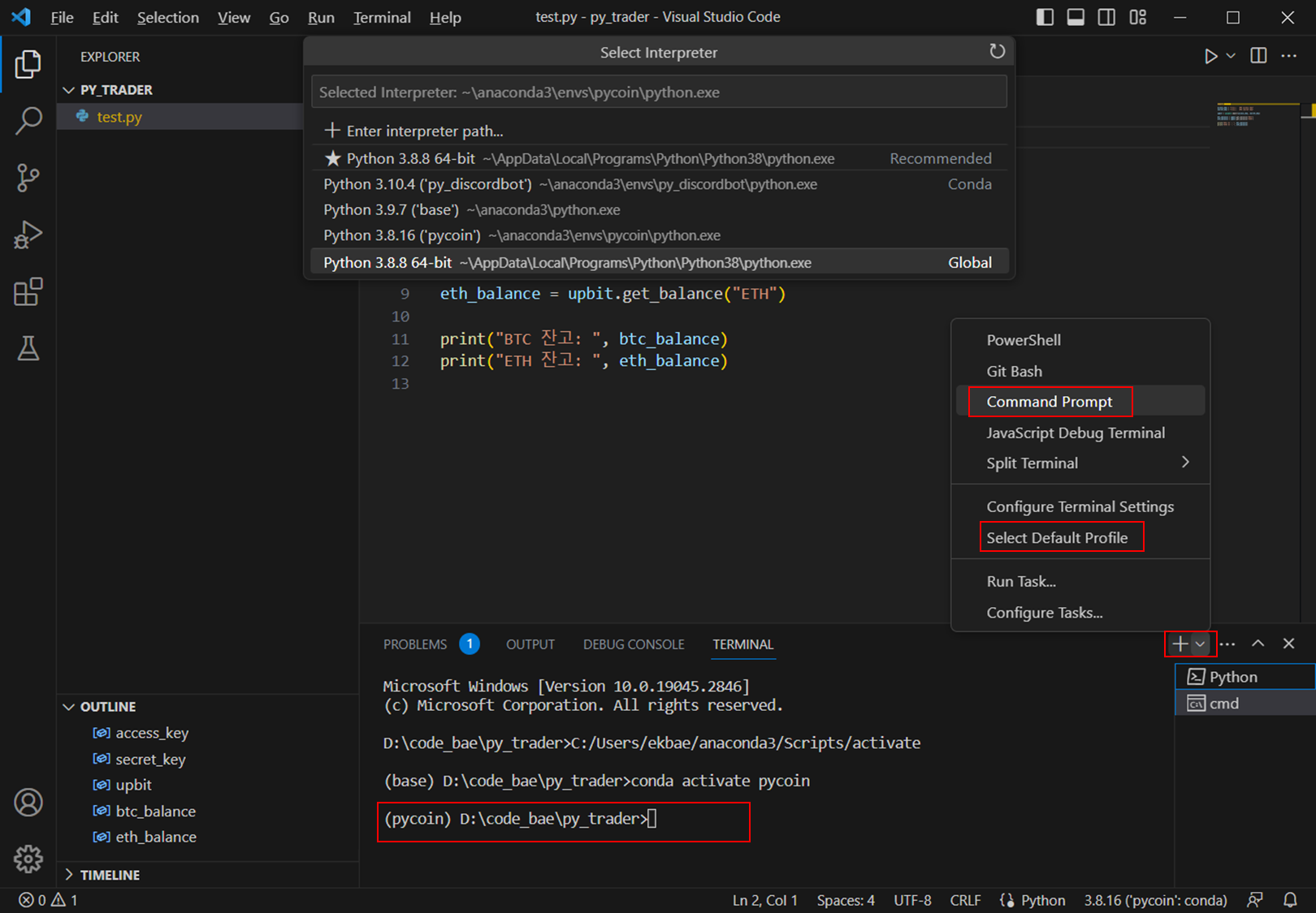 코드상으로 conda activate pycoin 을 쳐서 시키는 방법과 위의 다시 ctrl +shift+ p에서 python select interpreter 에서 (pycoin) 경로를 설정하는 방법입니다.